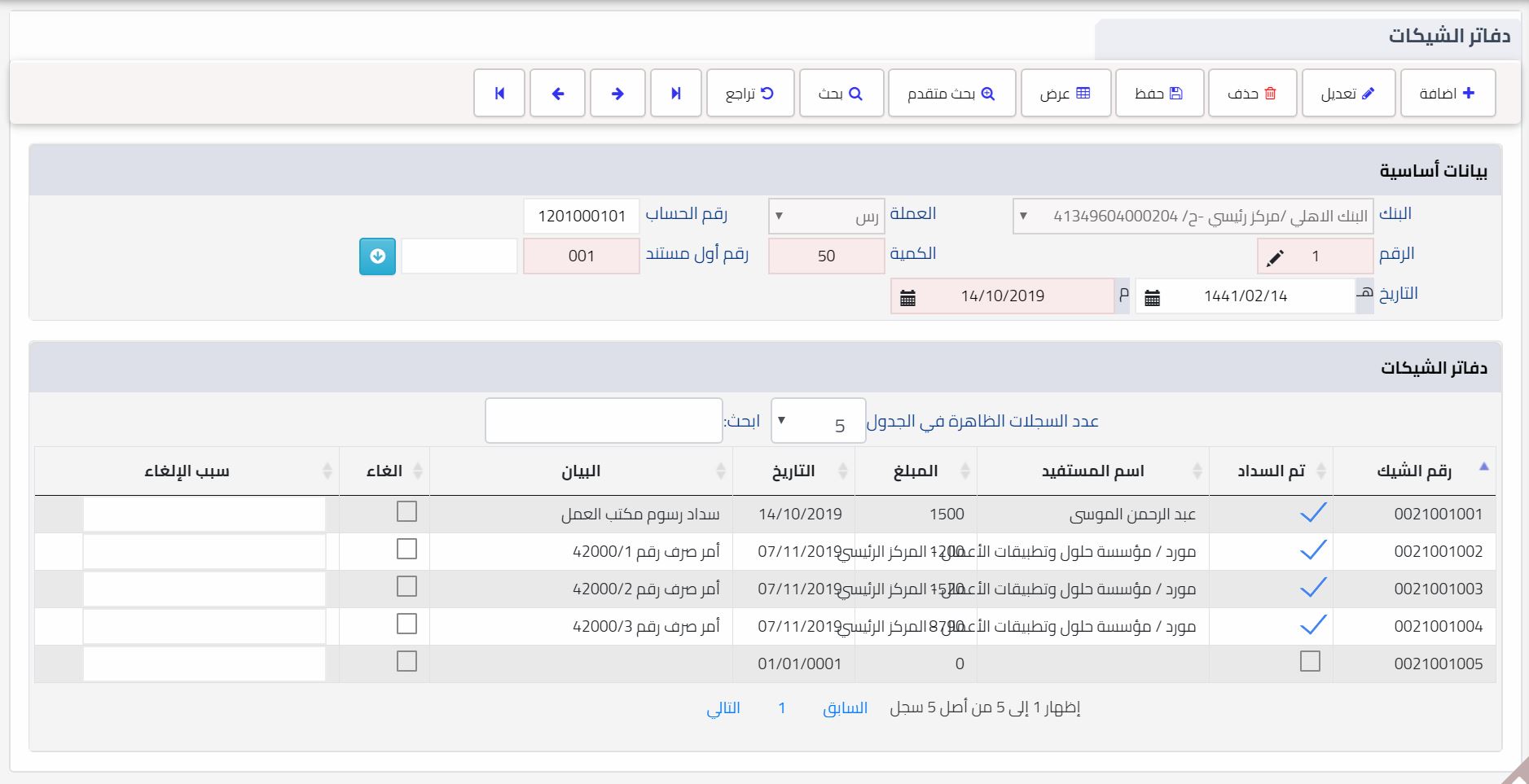 تسجيل بيانات دفاتر الشيكات لكل حساب بنكي .