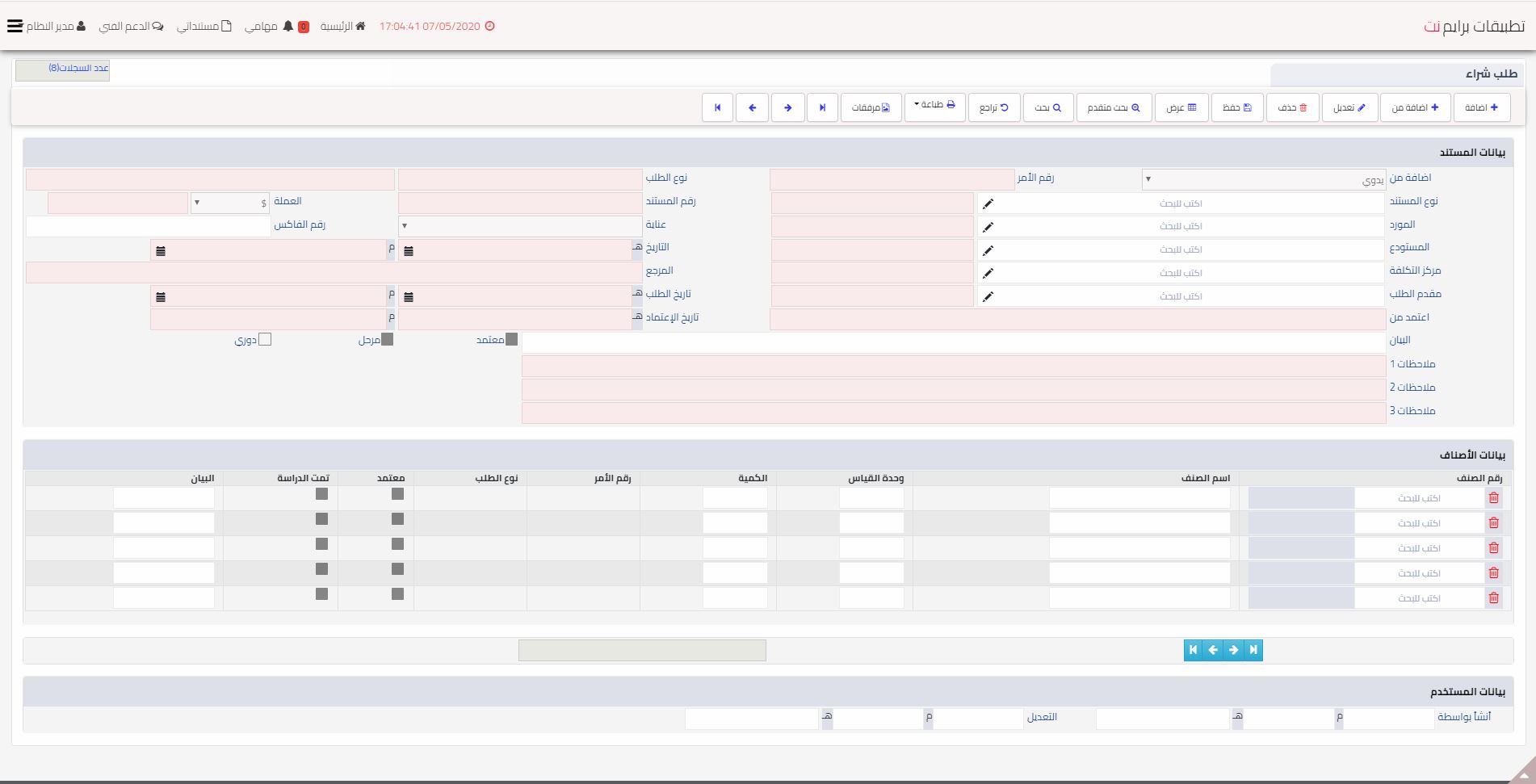 مستند لاصدار طلب الشراء للمواد و البضائع التي تحتاجها المنشأة، يدعم النظام تعريف عده انواع من طلبات الشراء ويرتبط كل نوع بمستودع ومستخدم ومركز تكلفه افتراضي مع امكانيه التعديل حسب صلاحيات المستخدم ،يدعم النظام امكانية اضافة طلب الشراء من طلب مواد مخزني او من طلبات العملاء، يوفر النظام امكانية اعتماد طلب الشراء قبل تحويله الى المستوى التالي يمكن ان يحول طلب الشراء الى طلب عرض سعر او عرض سعر اوأمر شراء بشكل مباشر دون الحاجه الى ادخال بياناته من جديد.