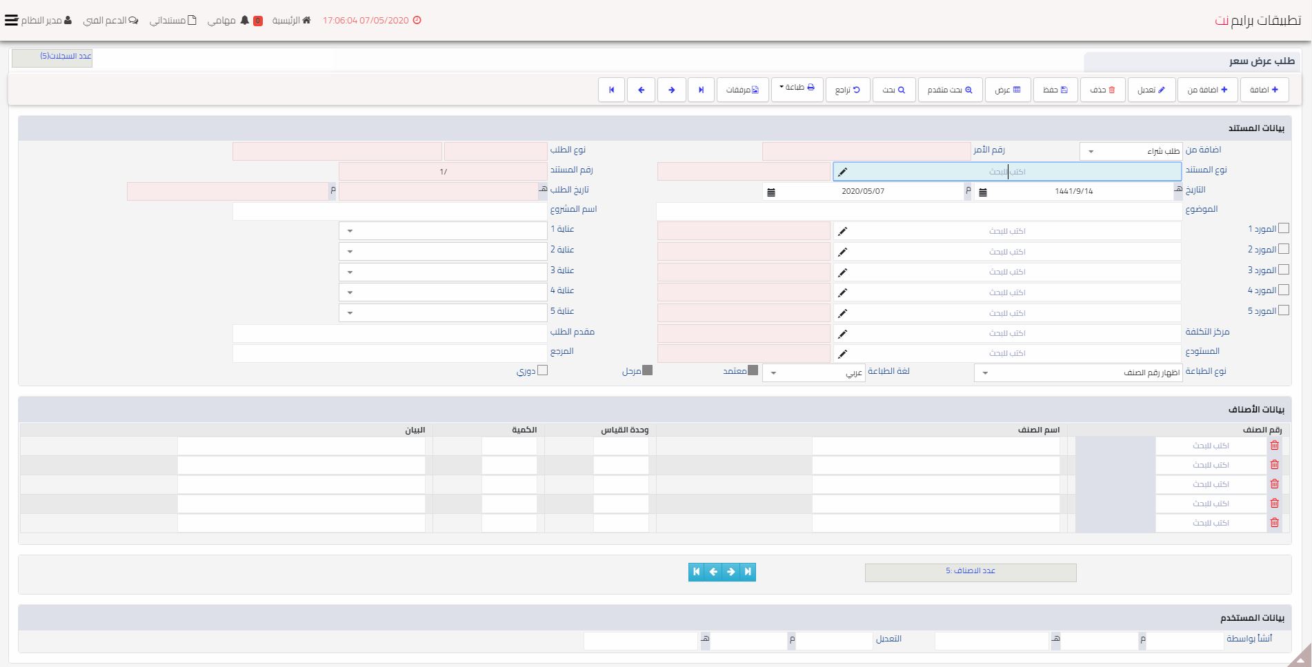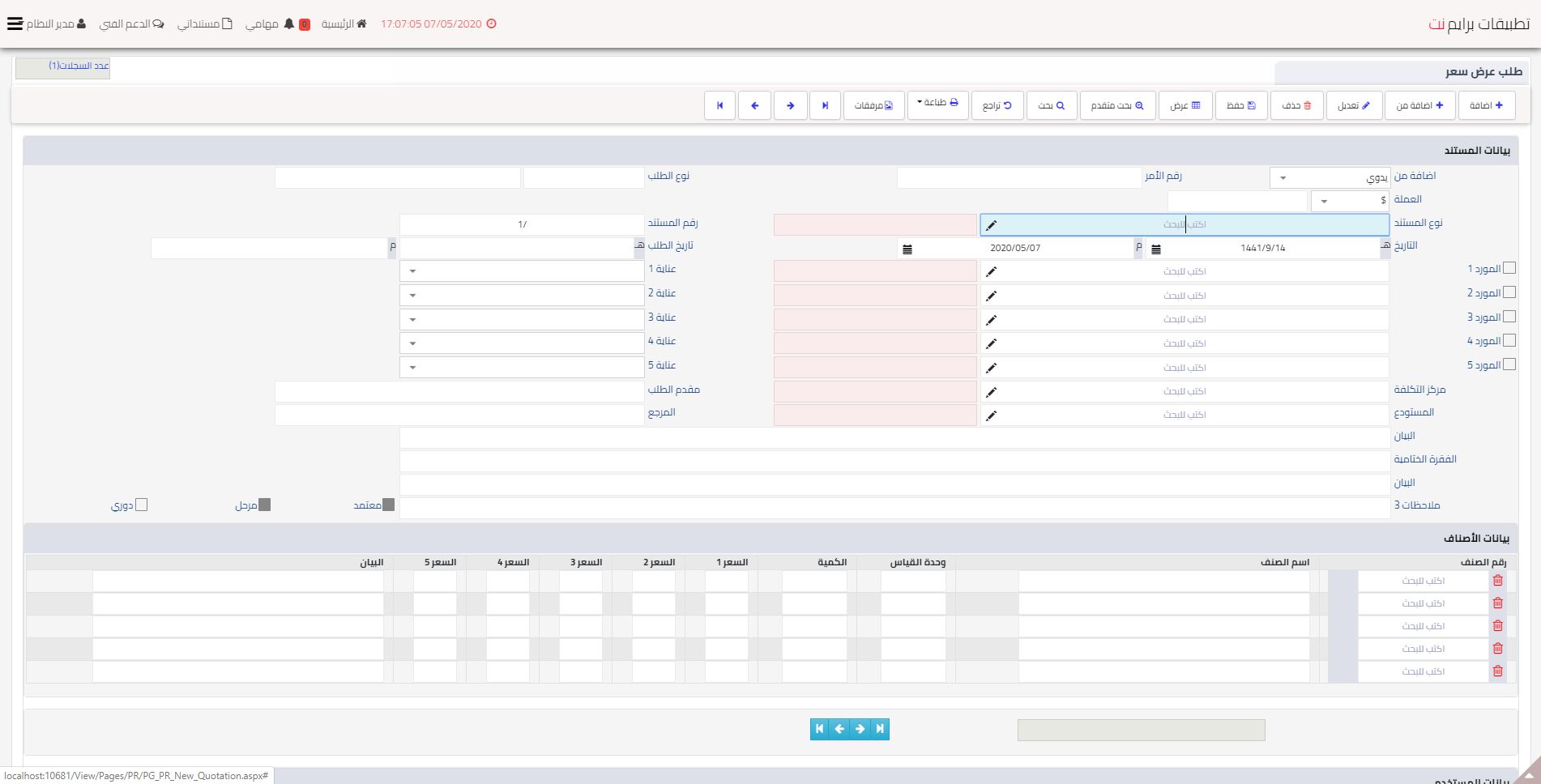 مستند يستخدم لاصدار دار طلب عرض سعر للموردين بالمواد و البضائع التي تحتاجها المنشأة، يدعم اضافه خمسة موردين في نفس المستند وذلك في حاله ارسال عرض الطلبات الى اكثر من مورد، وتوفر ميزة تعدد الموردين في نفس الطلب عمل مقارنه الية من النظام بأقل الاسعار و طباعة تقرير بذلك، يسمح النظام بطباعة الطلب عربي او انجليزي، يدعم النظام تعريف عدة انواع من طلبات عروض الاسعار ويرتبط كل نوع بمستودع ومستخدم و مركز تكلفة افتراضي مع امكانيه التعديل حسب صلاحيات المستخدم، يدعم النظام امكانيه طلب عرض السعر من طلب الشراء، يوفر النظام امكانيات اعتماد طلب عرض السعر من قبل تحويله الى المستند التالي، يمكن ان يحول طلب عرض السعر الى عرض سعر اوامر شراء بشكل مباشر دون الحاجه لادخال البيانات من جديد.