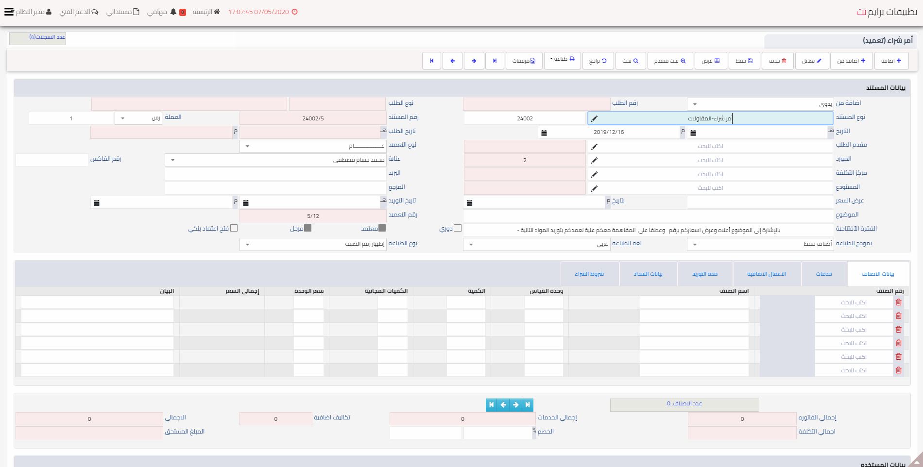 مستند يستخدم لاصدار اوامر الشراء بالمواد و البضائع التي تحتاجها المنشأة، يدعم النظام تعريف عدة انواع من اوامر الشراء ويرتبط كل نوع بمستودع ومستخدم و مركز تكلفه افتراضي مع امكانية التعديل حسب صلاحيات المستخدم، يدعم النظام امكانية اضافة امر الشراء من عرض سعر او طلب عرض سعر او طلب شراء اوامر الشراء قديم، يوفر النظام امكانية اعتماد امر الشراء قبل بدء التعامل معه في باقي دورة المشتريات.