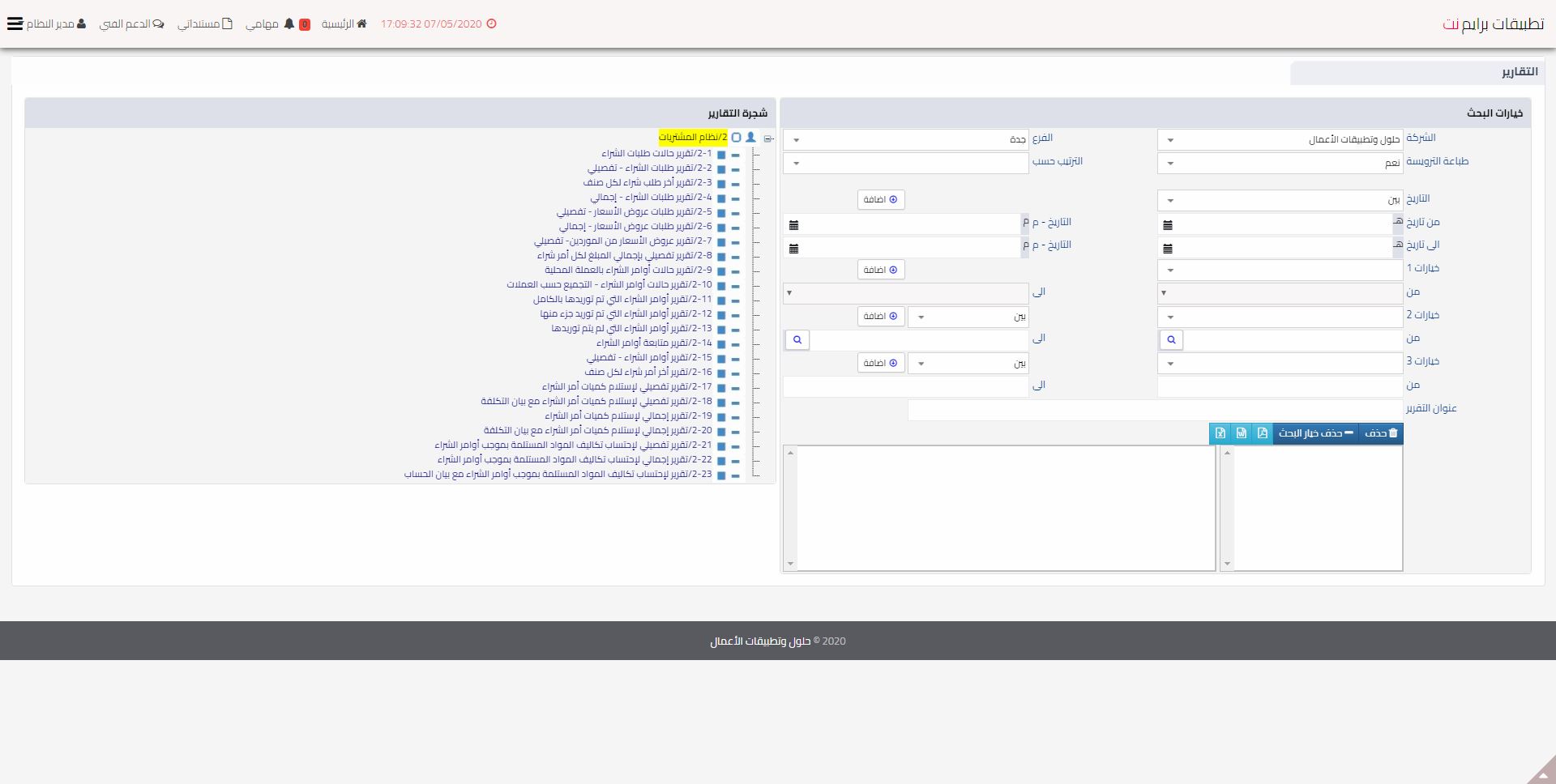 امكانية طباعة كافة تقارير النظام بالخيارات التاليه (الفرع ،مركز التكلفه ،المستودع ،المورد، المستخدم ،الاداره، الصنف ،فئه الصنف ،العمله ،طريقه السداد، تاريخ الاعتماد، تاريخ الادخال ،تاريخ المستند ،نوع المستند).